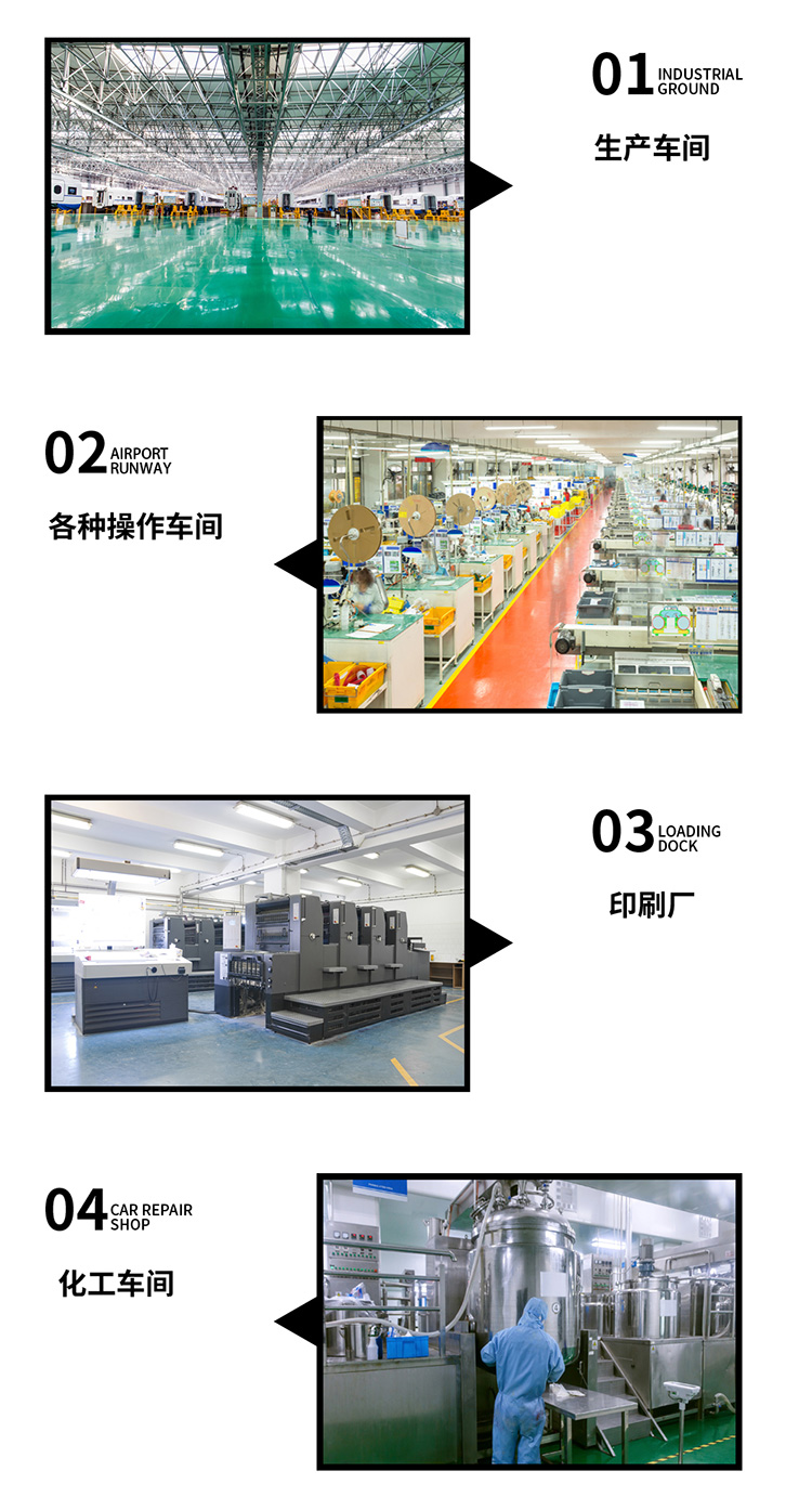 電器、電子、機械、食品、醫(yī)藥、化工、煙草、飲料、紡織、服裝、家具、塑料、文體用品等制造工廠的車間水泥或水磨石地面。